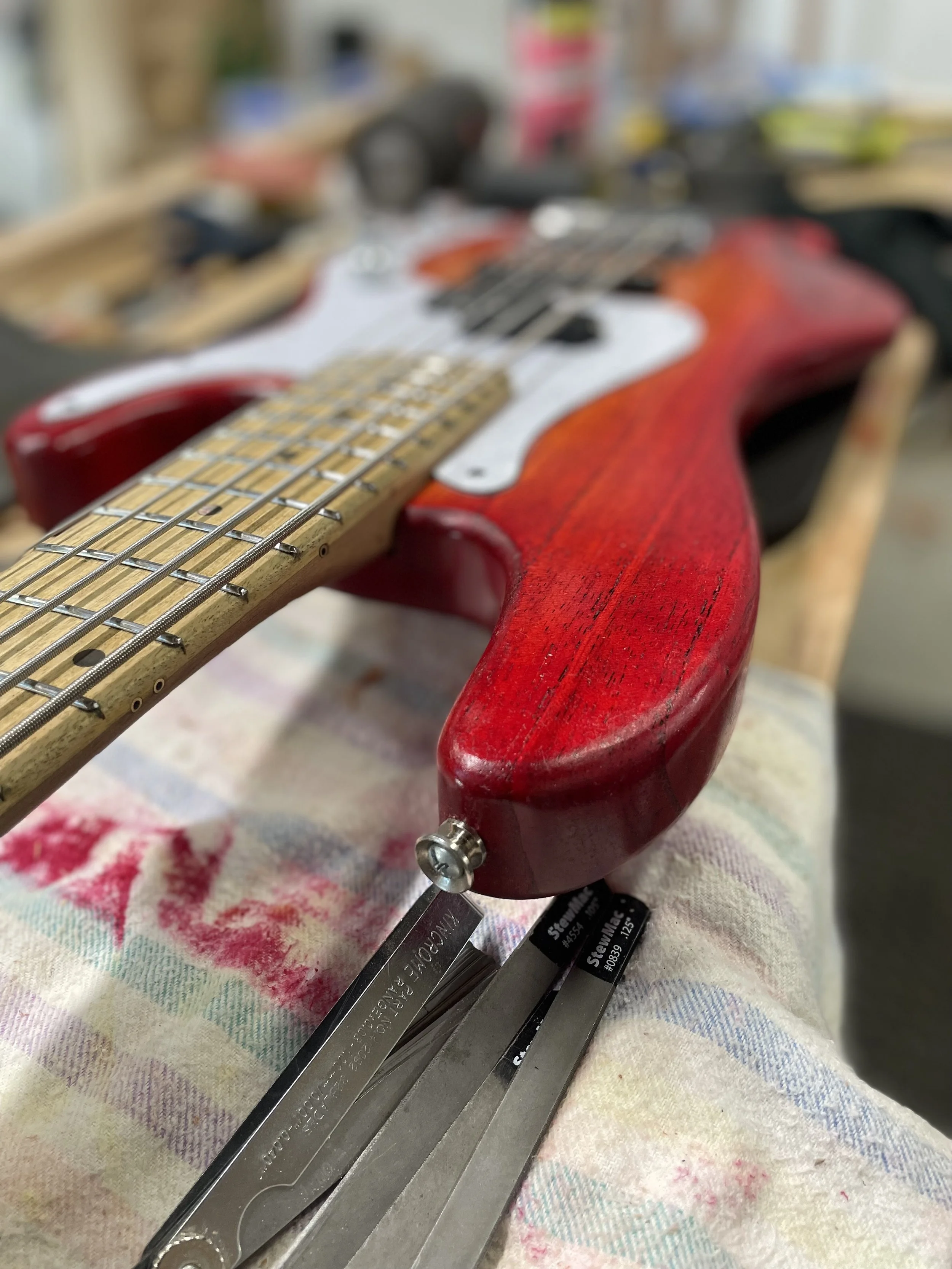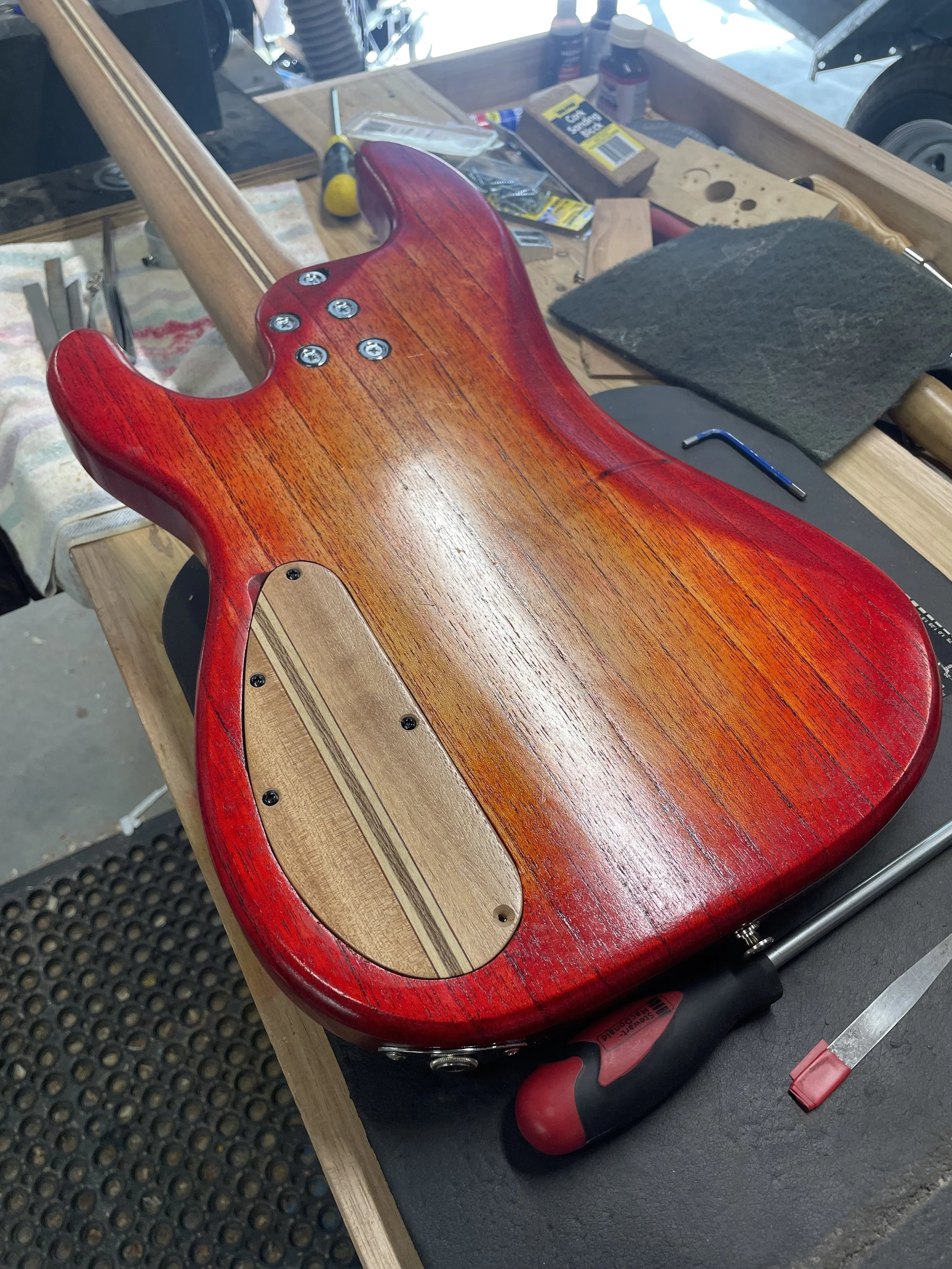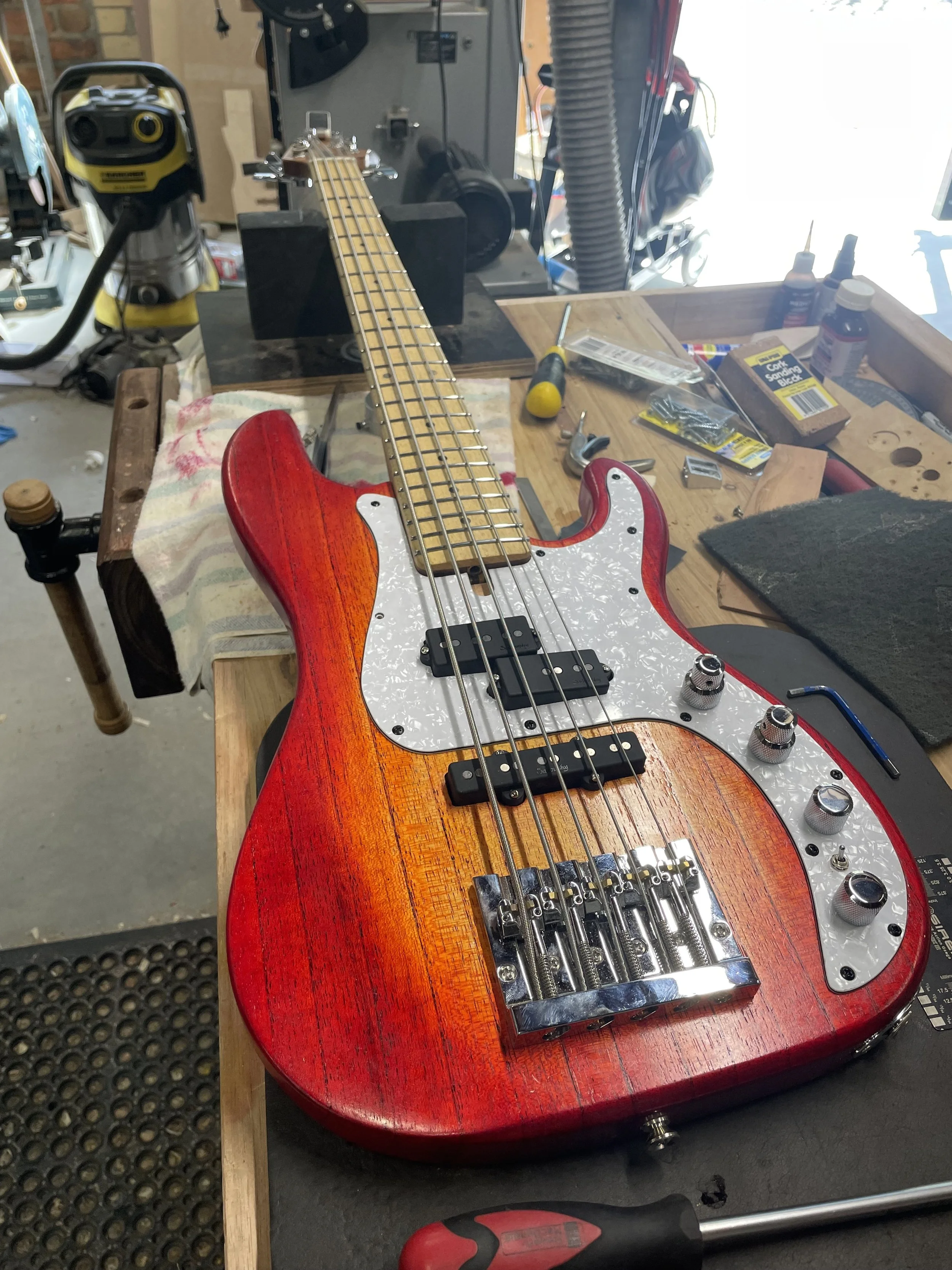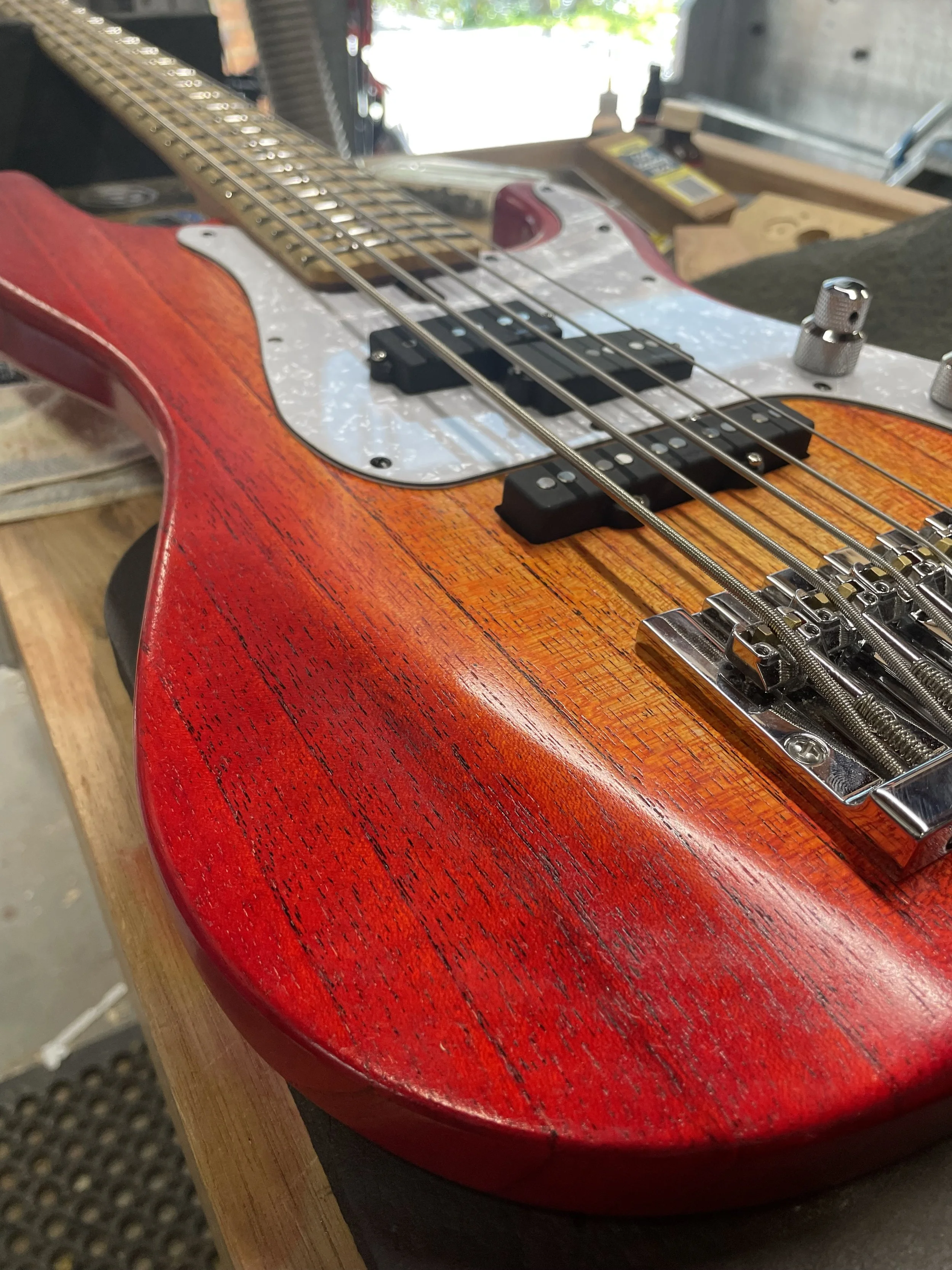 This custom build was for my friend Ellen, easily the hardest-working musician I know and all-round legend. The brief was for a light and versatile medium-scale five-string bass with active and passive capabilities. Ember was born out of our shared vision, with a striking colour scheme and a body shape to suit the player. Reminiscent of classic P-style body, but more compact in both height and length, it has been an oustanding workhorse with over 100 gigs in the first twelve months, from dusty outback festivals to heaving inner-city nightclubs, Ember still looks and plays like the day she left the workshop. She is and is as tough and uncompromising as her owner, changing lives everywhere she plays.