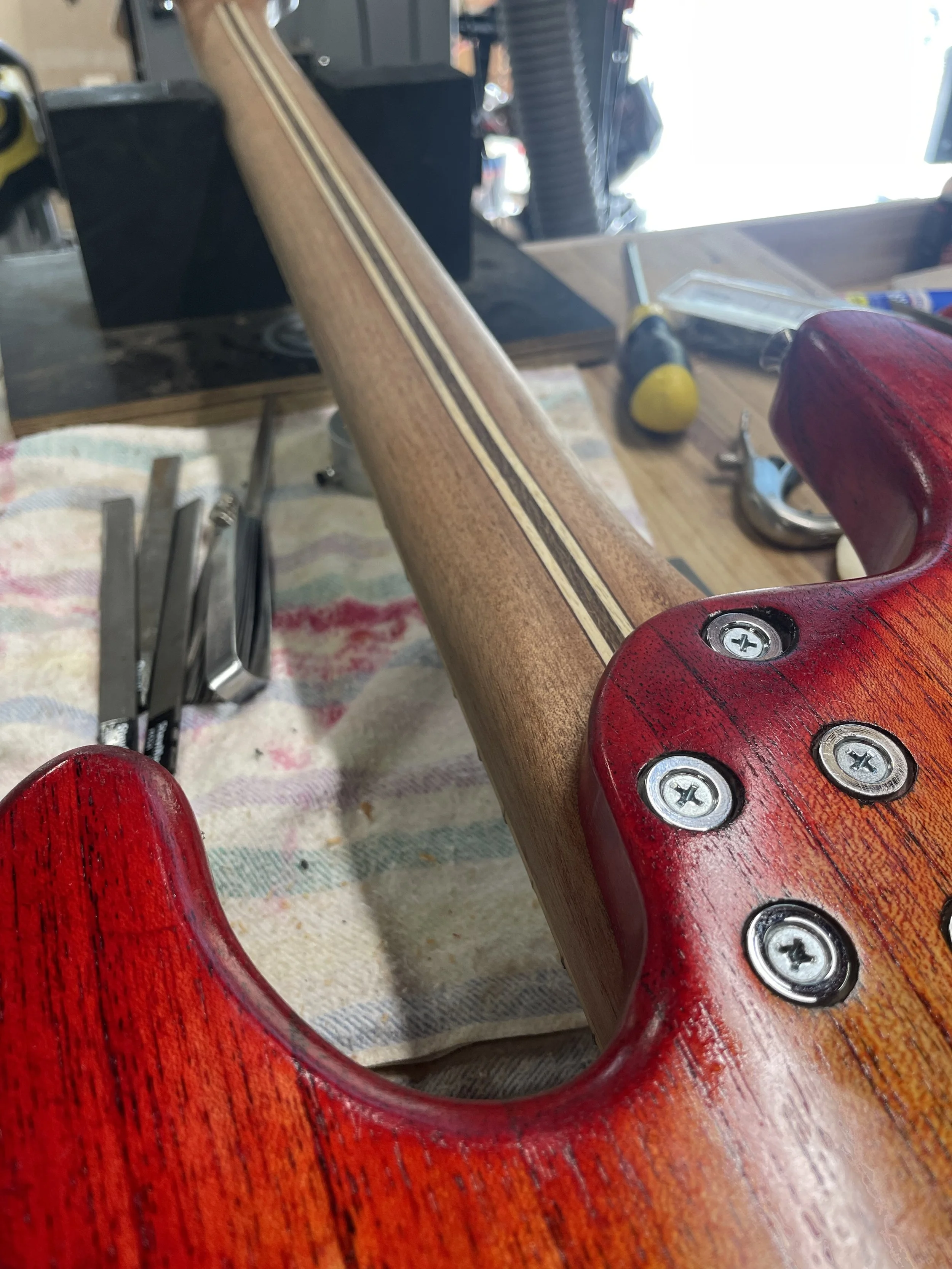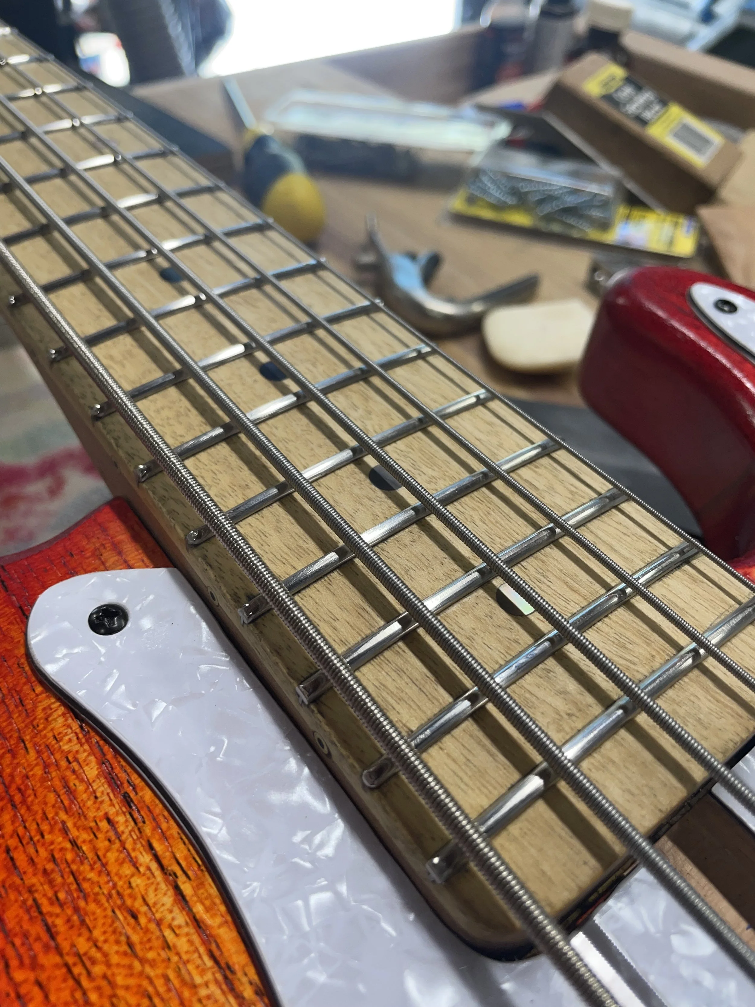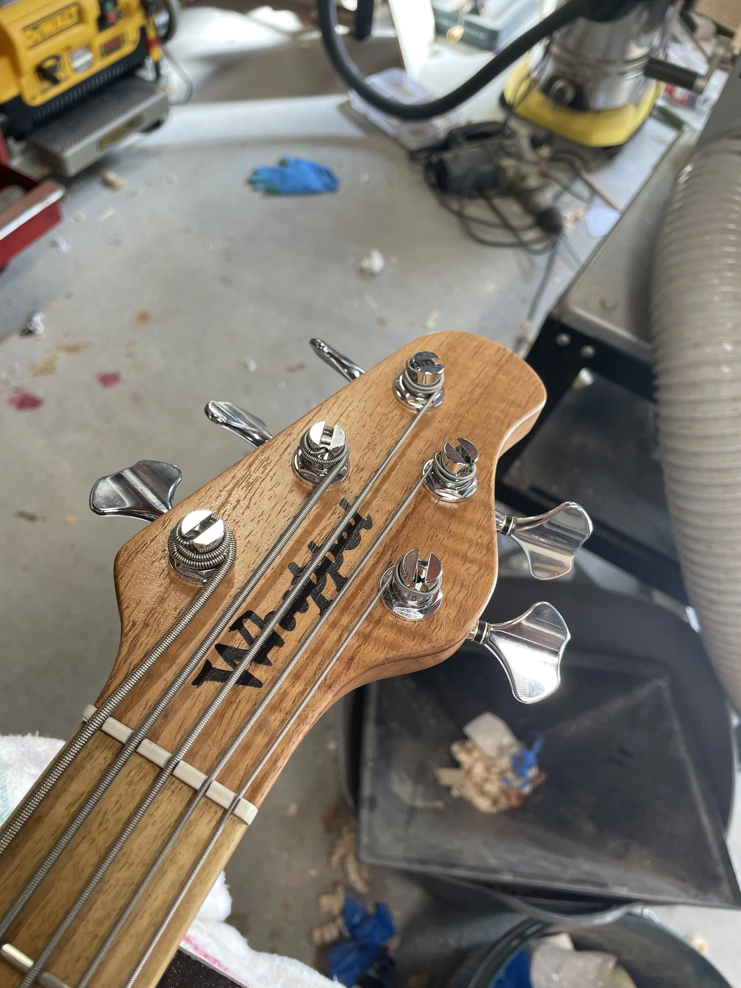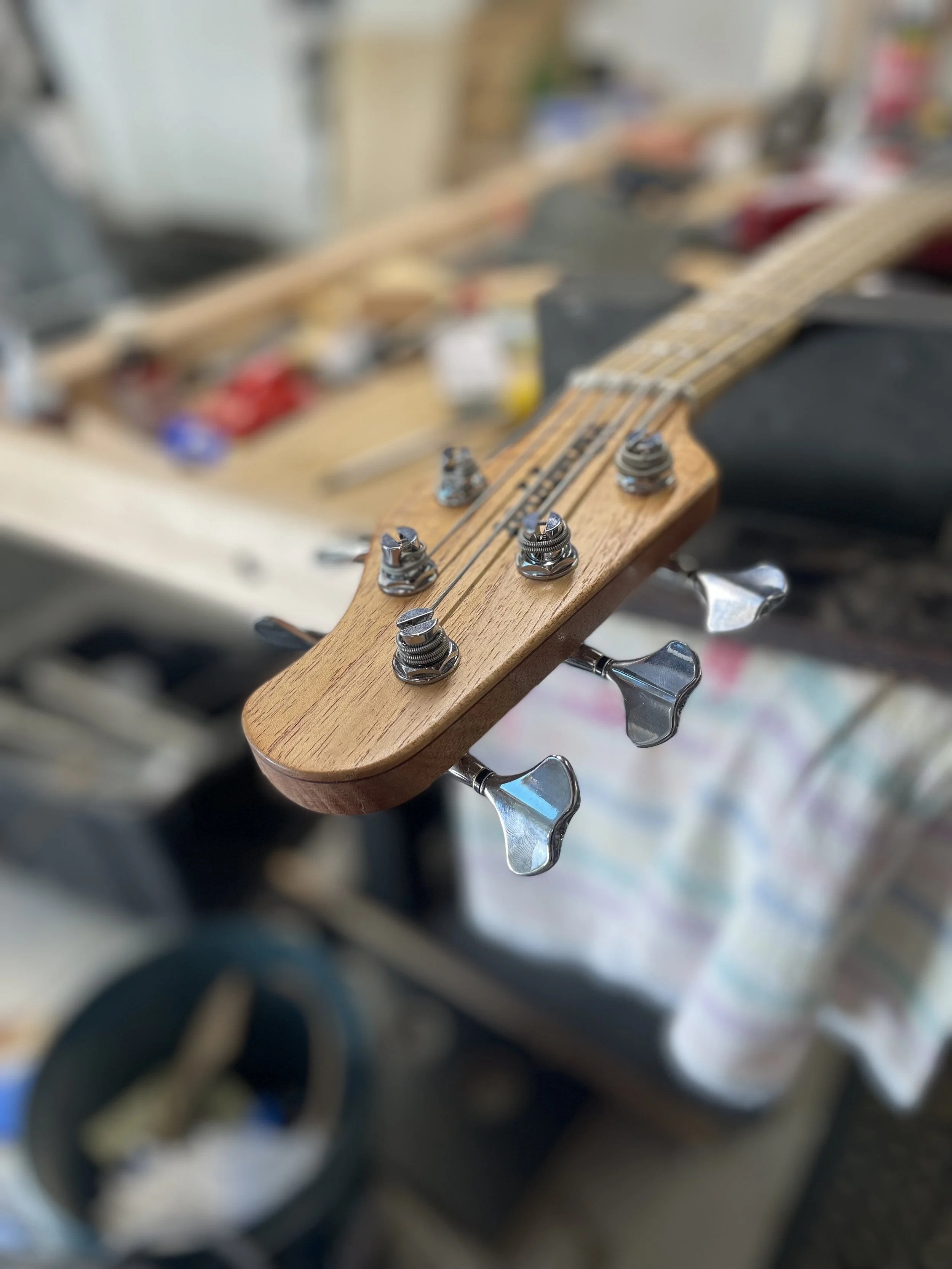 This custom build was for my friend Ellen, easily the hardest-working musician I know and all-round legend. The brief was for a light and versatile medium-scale five-string bass with active and passive capabilities. Ember was born out of our shared vision, with a striking colour scheme and a body shape to suit the player. Reminiscent of classic P-style body, but more compact in both height and length, it has been an oustanding workhorse with over 100 gigs in the first twelve months, from dusty outback festivals to heaving inner-city nightclubs, Ember still looks and plays like the day she left the workshop. She is and is as tough and uncompromising as her owner, changing lives everywhere she plays.